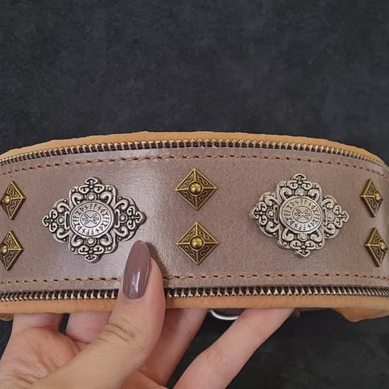 The 2.5 inch wide, studded genuine leather "Aztec" collar.