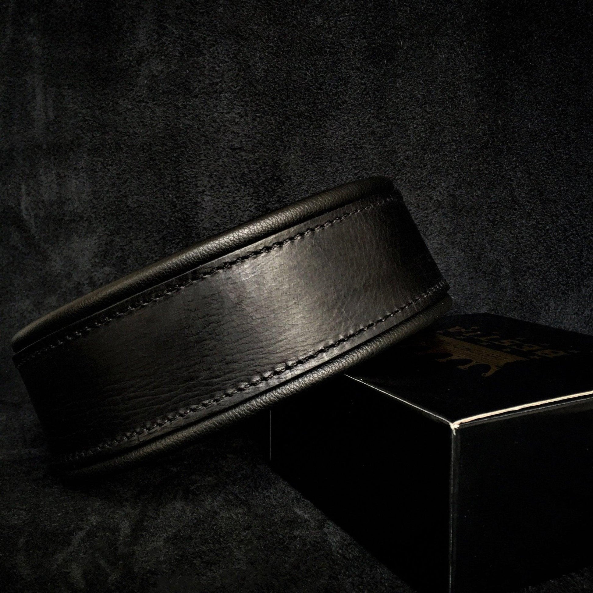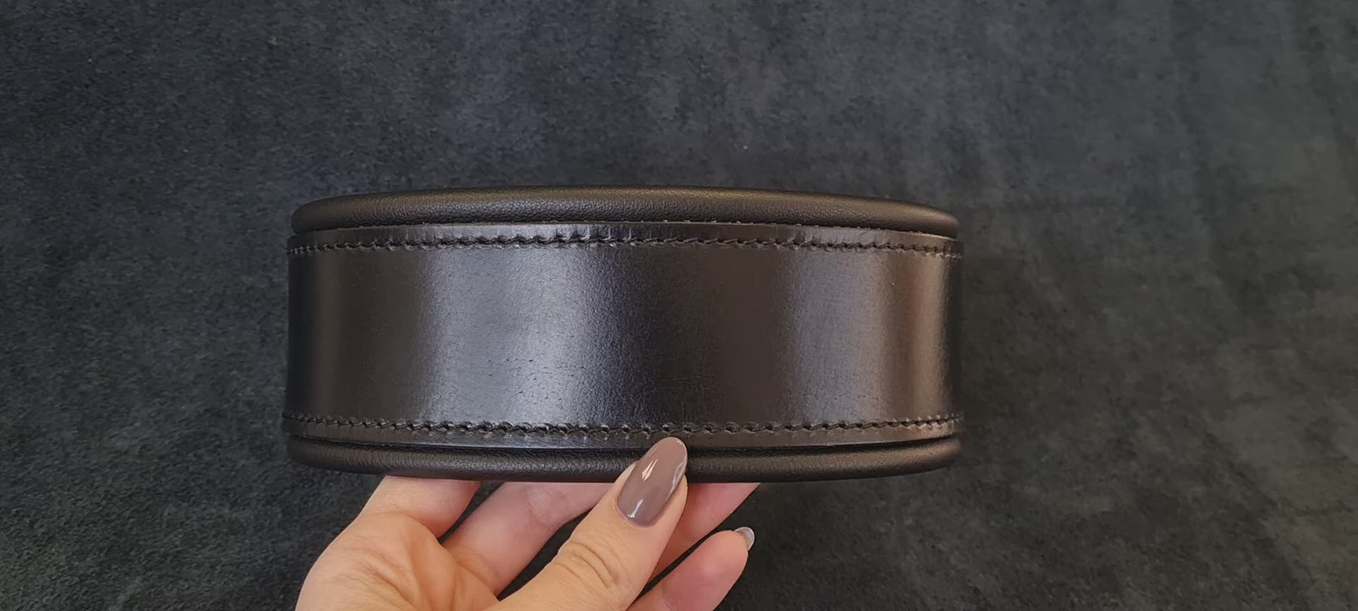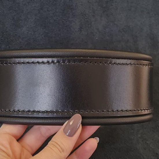 This collar has a 4 mm thick base layer from Italian belt leather and a soft lamb leather cushion on the inside.