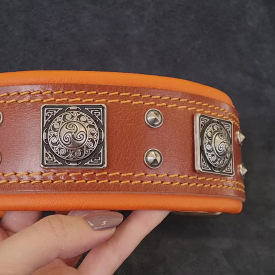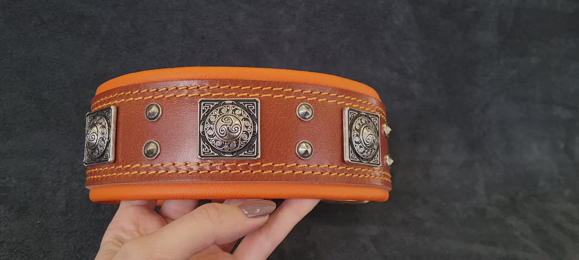 The base layer of this collar is out of 4 mm thick German belt leather of the highest quality. It is very strong and durable. The inside layer is our patented soft leather and orthopedic foam cushion. It is also out of 100% genuine Nappa leather.